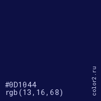 Цвет #0D1044 в цветовой модели RGB обозначается тремя октетами (13, 16, 68) в десятичном формате и #0D1044 в шестнадцатиричном (hex) формате, которые являются интенсивностью красного 13 (hex 0D), интенсивность зелёного 16 (hex 10) и интенсивность синего 68 (hex 44).