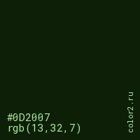 Цвет #0D2007 в цветовой модели RGB обозначается тремя октетами (13, 32, 7) в десятичном формате и #0D2007 в шестнадцатиричном (hex) формате, которые являются интенсивностью красного 13 (hex 0D), интенсивность зелёного 32 (hex 20) и интенсивность синего 7 (hex 07).