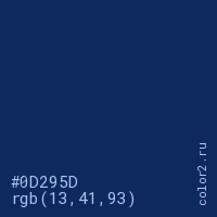 Цвет #0D295D в цветовой модели RGB обозначается тремя октетами (13, 41, 93) в десятичном формате и #0D295D в шестнадцатиричном (hex) формате, которые являются интенсивностью красного 13 (hex 0D), интенсивность зелёного 41 (hex 29) и интенсивность синего 93 (hex 5D).