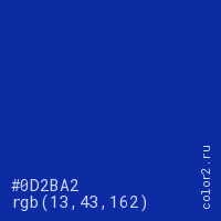 Цвет #0D2BA2 в цветовой модели RGB обозначается тремя октетами (13, 43, 162) в десятичном формате и #0D2BA2 в шестнадцатиричном (hex) формате, которые являются интенсивностью красного 13 (hex 0D), интенсивность зелёного 43 (hex 2B) и интенсивность синего 162 (hex A2).