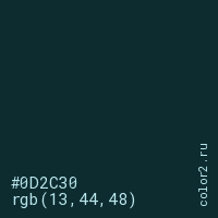 Цвет #0D2C30 в цветовой модели RGB обозначается тремя октетами (13, 44, 48) в десятичном формате и #0D2C30 в шестнадцатиричном (hex) формате, которые являются интенсивностью красного 13 (hex 0D), интенсивность зелёного 44 (hex 2C) и интенсивность синего 48 (hex 30).