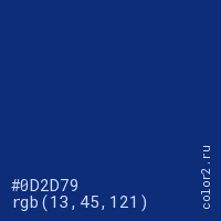 Цвет #0D2D79 в цветовой модели RGB обозначается тремя октетами (13, 45, 121) в десятичном формате и #0D2D79 в шестнадцатиричном (hex) формате, которые являются интенсивностью красного 13 (hex 0D), интенсивность зелёного 45 (hex 2D) и интенсивность синего 121 (hex 79).