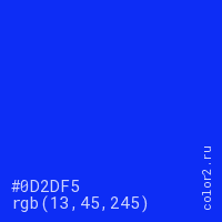 Цвет #0D2DF5 в цветовой модели RGB обозначается тремя октетами (13, 45, 245) в десятичном формате и #0D2DF5 в шестнадцатиричном (hex) формате, которые являются интенсивностью красного 13 (hex 0D), интенсивность зелёного 45 (hex 2D) и интенсивность синего 245 (hex F5).