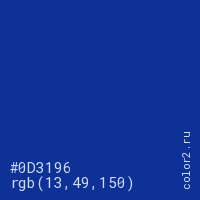 Цвет #0D3196 в цветовой модели RGB обозначается тремя октетами (13, 49, 150) в десятичном формате и #0D3196 в шестнадцатиричном (hex) формате, которые являются интенсивностью красного 13 (hex 0D), интенсивность зелёного 49 (hex 31) и интенсивность синего 150 (hex 96).