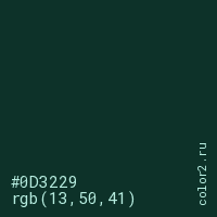 Цвет #0D3229 в цветовой модели RGB обозначается тремя октетами (13, 50, 41) в десятичном формате и #0D3229 в шестнадцатиричном (hex) формате, которые являются интенсивностью красного 13 (hex 0D), интенсивность зелёного 50 (hex 32) и интенсивность синего 41 (hex 29).