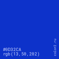 Цвет #0D32CA в цветовой модели RGB обозначается тремя октетами (13, 50, 202) в десятичном формате и #0D32CA в шестнадцатиричном (hex) формате, которые являются интенсивностью красного 13 (hex 0D), интенсивность зелёного 50 (hex 32) и интенсивность синего 202 (hex CA).