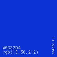 Цвет #0D32D4 в цветовой модели RGB обозначается тремя октетами (13, 50, 212) в десятичном формате и #0D32D4 в шестнадцатиричном (hex) формате, которые являются интенсивностью красного 13 (hex 0D), интенсивность зелёного 50 (hex 32) и интенсивность синего 212 (hex D4).
