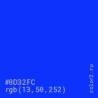 Цвет #0D32FC в цветовой модели RGB обозначается тремя октетами (13, 50, 252) в десятичном формате и #0D32FC в шестнадцатиричном (hex) формате, которые являются интенсивностью красного 13 (hex 0D), интенсивность зелёного 50 (hex 32) и интенсивность синего 252 (hex FC).