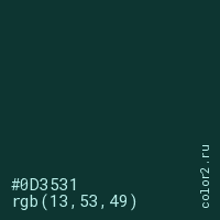 Цвет #0D3531 в цветовой модели RGB обозначается тремя октетами (13, 53, 49) в десятичном формате и #0D3531 в шестнадцатиричном (hex) формате, которые являются интенсивностью красного 13 (hex 0D), интенсивность зелёного 53 (hex 35) и интенсивность синего 49 (hex 31).