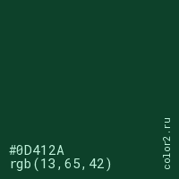 Цвет #0D412A в цветовой модели RGB обозначается тремя октетами (13, 65, 42) в десятичном формате и #0D412A в шестнадцатиричном (hex) формате, которые являются интенсивностью красного 13 (hex 0D), интенсивность зелёного 65 (hex 41) и интенсивность синего 42 (hex 2A).