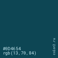 Цвет #0D4654 в цветовой модели RGB обозначается тремя октетами (13, 70, 84) в десятичном формате и #0D4654 в шестнадцатиричном (hex) формате, которые являются интенсивностью красного 13 (hex 0D), интенсивность зелёного 70 (hex 46) и интенсивность синего 84 (hex 54).
