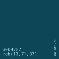 Цвет #0D4757 в цветовой модели RGB обозначается тремя октетами (13, 71, 87) в десятичном формате и #0D4757 в шестнадцатиричном (hex) формате, которые являются интенсивностью красного 13 (hex 0D), интенсивность зелёного 71 (hex 47) и интенсивность синего 87 (hex 57).