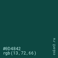 Цвет #0D4842 в цветовой модели RGB обозначается тремя октетами (13, 72, 66) в десятичном формате и #0D4842 в шестнадцатиричном (hex) формате, которые являются интенсивностью красного 13 (hex 0D), интенсивность зелёного 72 (hex 48) и интенсивность синего 66 (hex 42).
