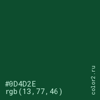 Цвет #0D4D2E в цветовой модели RGB обозначается тремя октетами (13, 77, 46) в десятичном формате и #0D4D2E в шестнадцатиричном (hex) формате, которые являются интенсивностью красного 13 (hex 0D), интенсивность зелёного 77 (hex 4D) и интенсивность синего 46 (hex 2E).