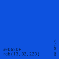 Цвет #0D52DF в цветовой модели RGB обозначается тремя октетами (13, 82, 223) в десятичном формате и #0D52DF в шестнадцатиричном (hex) формате, которые являются интенсивностью красного 13 (hex 0D), интенсивность зелёного 82 (hex 52) и интенсивность синего 223 (hex DF).