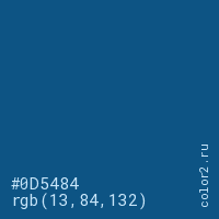 Цвет #0D5484 в цветовой модели RGB обозначается тремя октетами (13, 84, 132) в десятичном формате и #0D5484 в шестнадцатиричном (hex) формате, которые являются интенсивностью красного 13 (hex 0D), интенсивность зелёного 84 (hex 54) и интенсивность синего 132 (hex 84).
