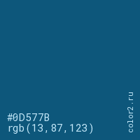 Цвет #0D577B в цветовой модели RGB обозначается тремя октетами (13, 87, 123) в десятичном формате и #0D577B в шестнадцатиричном (hex) формате, которые являются интенсивностью красного 13 (hex 0D), интенсивность зелёного 87 (hex 57) и интенсивность синего 123 (hex 7B).