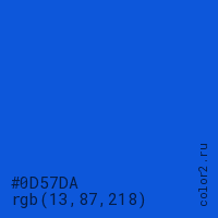 Цвет #0D57DA в цветовой модели RGB обозначается тремя октетами (13, 87, 218) в десятичном формате и #0D57DA в шестнадцатиричном (hex) формате, которые являются интенсивностью красного 13 (hex 0D), интенсивность зелёного 87 (hex 57) и интенсивность синего 218 (hex DA).