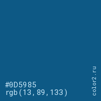 Цвет #0D5985 в цветовой модели RGB обозначается тремя октетами (13, 89, 133) в десятичном формате и #0D5985 в шестнадцатиричном (hex) формате, которые являются интенсивностью красного 13 (hex 0D), интенсивность зелёного 89 (hex 59) и интенсивность синего 133 (hex 85).