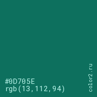 Цвет #0D705E в цветовой модели RGB обозначается тремя октетами (13, 112, 94) в десятичном формате и #0D705E в шестнадцатиричном (hex) формате, которые являются интенсивностью красного 13 (hex 0D), интенсивность зелёного 112 (hex 70) и интенсивность синего 94 (hex 5E).
