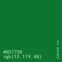 Цвет #0D7730 в цветовой модели RGB обозначается тремя октетами (13, 119, 48) в десятичном формате и #0D7730 в шестнадцатиричном (hex) формате, которые являются интенсивностью красного 13 (hex 0D), интенсивность зелёного 119 (hex 77) и интенсивность синего 48 (hex 30).