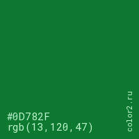 Цвет #0D782F в цветовой модели RGB обозначается тремя октетами (13, 120, 47) в десятичном формате и #0D782F в шестнадцатиричном (hex) формате, которые являются интенсивностью красного 13 (hex 0D), интенсивность зелёного 120 (hex 78) и интенсивность синего 47 (hex 2F).