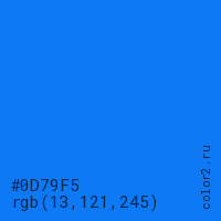 Цвет #0D79F5 в цветовой модели RGB обозначается тремя октетами (13, 121, 245) в десятичном формате и #0D79F5 в шестнадцатиричном (hex) формате, которые являются интенсивностью красного 13 (hex 0D), интенсивность зелёного 121 (hex 79) и интенсивность синего 245 (hex F5).