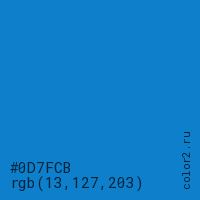 Цвет #0D7FCB в цветовой модели RGB обозначается тремя октетами (13, 127, 203) в десятичном формате и #0D7FCB в шестнадцатиричном (hex) формате, которые являются интенсивностью красного 13 (hex 0D), интенсивность зелёного 127 (hex 7F) и интенсивность синего 203 (hex CB).