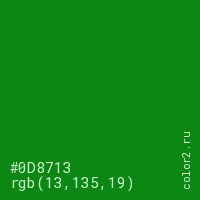Цвет #0D8713 в цветовой модели RGB обозначается тремя октетами (13, 135, 19) в десятичном формате и #0D8713 в шестнадцатиричном (hex) формате, которые являются интенсивностью красного 13 (hex 0D), интенсивность зелёного 135 (hex 87) и интенсивность синего 19 (hex 13).
