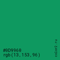 Цвет #0D9960 в цветовой модели RGB обозначается тремя октетами (13, 153, 96) в десятичном формате и #0D9960 в шестнадцатиричном (hex) формате, которые являются интенсивностью красного 13 (hex 0D), интенсивность зелёного 153 (hex 99) и интенсивность синего 96 (hex 60).