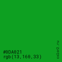 Цвет #0DA021 в цветовой модели RGB обозначается тремя октетами (13, 160, 33) в десятичном формате и #0DA021 в шестнадцатиричном (hex) формате, которые являются интенсивностью красного 13 (hex 0D), интенсивность зелёного 160 (hex A0) и интенсивность синего 33 (hex 21).