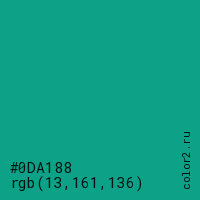 Цвет #0DA188 в цветовой модели RGB обозначается тремя октетами (13, 161, 136) в десятичном формате и #0DA188 в шестнадцатиричном (hex) формате, которые являются интенсивностью красного 13 (hex 0D), интенсивность зелёного 161 (hex A1) и интенсивность синего 136 (hex 88).
