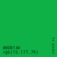 Цвет #0DB146 в цветовой модели RGB обозначается тремя октетами (13, 177, 70) в десятичном формате и #0DB146 в шестнадцатиричном (hex) формате, которые являются интенсивностью красного 13 (hex 0D), интенсивность зелёного 177 (hex B1) и интенсивность синего 70 (hex 46).
