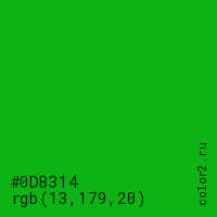 Цвет #0DB314 в цветовой модели RGB обозначается тремя октетами (13, 179, 20) в десятичном формате и #0DB314 в шестнадцатиричном (hex) формате, которые являются интенсивностью красного 13 (hex 0D), интенсивность зелёного 179 (hex B3) и интенсивность синего 20 (hex 14).