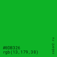 Цвет #0DB326 в цветовой модели RGB обозначается тремя октетами (13, 179, 38) в десятичном формате и #0DB326 в шестнадцатиричном (hex) формате, которые являются интенсивностью красного 13 (hex 0D), интенсивность зелёного 179 (hex B3) и интенсивность синего 38 (hex 26).