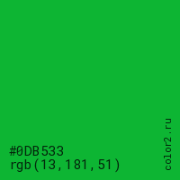 Цвет #0DB533 в цветовой модели RGB обозначается тремя октетами (13, 181, 51) в десятичном формате и #0DB533 в шестнадцатиричном (hex) формате, которые являются интенсивностью красного 13 (hex 0D), интенсивность зелёного 181 (hex B5) и интенсивность синего 51 (hex 33).