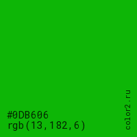 Цвет #0DB606 в цветовой модели RGB обозначается тремя октетами (13, 182, 6) в десятичном формате и #0DB606 в шестнадцатиричном (hex) формате, которые являются интенсивностью красного 13 (hex 0D), интенсивность зелёного 182 (hex B6) и интенсивность синего 6 (hex 06).