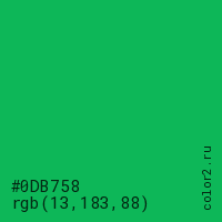 Цвет #0DB758 в цветовой модели RGB обозначается тремя октетами (13, 183, 88) в десятичном формате и #0DB758 в шестнадцатиричном (hex) формате, которые являются интенсивностью красного 13 (hex 0D), интенсивность зелёного 183 (hex B7) и интенсивность синего 88 (hex 58).