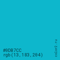 Цвет #0DB7CC в цветовой модели RGB обозначается тремя октетами (13, 183, 204) в десятичном формате и #0DB7CC в шестнадцатиричном (hex) формате, которые являются интенсивностью красного 13 (hex 0D), интенсивность зелёного 183 (hex B7) и интенсивность синего 204 (hex CC).