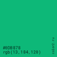 Цвет #0DB878 в цветовой модели RGB обозначается тремя октетами (13, 184, 120) в десятичном формате и #0DB878 в шестнадцатиричном (hex) формате, которые являются интенсивностью красного 13 (hex 0D), интенсивность зелёного 184 (hex B8) и интенсивность синего 120 (hex 78).