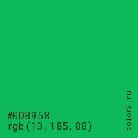 Цвет #0DB958 в цветовой модели RGB обозначается тремя октетами (13, 185, 88) в десятичном формате и #0DB958 в шестнадцатиричном (hex) формате, которые являются интенсивностью красного 13 (hex 0D), интенсивность зелёного 185 (hex B9) и интенсивность синего 88 (hex 58).