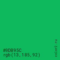 Цвет #0DB95C в цветовой модели RGB обозначается тремя октетами (13, 185, 92) в десятичном формате и #0DB95C в шестнадцатиричном (hex) формате, которые являются интенсивностью красного 13 (hex 0D), интенсивность зелёного 185 (hex B9) и интенсивность синего 92 (hex 5C).