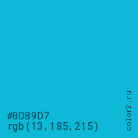Цвет #0DB9D7 в цветовой модели RGB обозначается тремя октетами (13, 185, 215) в десятичном формате и #0DB9D7 в шестнадцатиричном (hex) формате, которые являются интенсивностью красного 13 (hex 0D), интенсивность зелёного 185 (hex B9) и интенсивность синего 215 (hex D7).