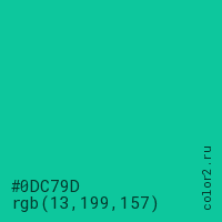 Цвет #0DC79D в цветовой модели RGB обозначается тремя октетами (13, 199, 157) в десятичном формате и #0DC79D в шестнадцатиричном (hex) формате, которые являются интенсивностью красного 13 (hex 0D), интенсивность зелёного 199 (hex C7) и интенсивность синего 157 (hex 9D).