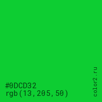 Цвет #0DCD32 в цветовой модели RGB обозначается тремя октетами (13, 205, 50) в десятичном формате и #0DCD32 в шестнадцатиричном (hex) формате, которые являются интенсивностью красного 13 (hex 0D), интенсивность зелёного 205 (hex CD) и интенсивность синего 50 (hex 32).