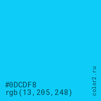 Цвет #0DCDF8 в цветовой модели RGB обозначается тремя октетами (13, 205, 248) в десятичном формате и #0DCDF8 в шестнадцатиричном (hex) формате, которые являются интенсивностью красного 13 (hex 0D), интенсивность зелёного 205 (hex CD) и интенсивность синего 248 (hex F8).