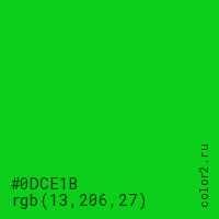 Цвет #0DCE1B в цветовой модели RGB обозначается тремя октетами (13, 206, 27) в десятичном формате и #0DCE1B в шестнадцатиричном (hex) формате, которые являются интенсивностью красного 13 (hex 0D), интенсивность зелёного 206 (hex CE) и интенсивность синего 27 (hex 1B).