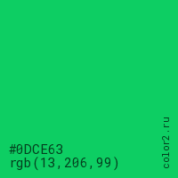 Цвет #0DCE63 в цветовой модели RGB обозначается тремя октетами (13, 206, 99) в десятичном формате и #0DCE63 в шестнадцатиричном (hex) формате, которые являются интенсивностью красного 13 (hex 0D), интенсивность зелёного 206 (hex CE) и интенсивность синего 99 (hex 63).