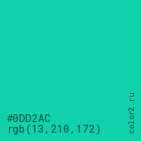 Цвет #0DD2AC в цветовой модели RGB обозначается тремя октетами (13, 210, 172) в десятичном формате и #0DD2AC в шестнадцатиричном (hex) формате, которые являются интенсивностью красного 13 (hex 0D), интенсивность зелёного 210 (hex D2) и интенсивность синего 172 (hex AC).