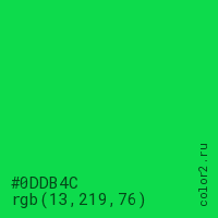 Цвет #0DDB4C в цветовой модели RGB обозначается тремя октетами (13, 219, 76) в десятичном формате и #0DDB4C в шестнадцатиричном (hex) формате, которые являются интенсивностью красного 13 (hex 0D), интенсивность зелёного 219 (hex DB) и интенсивность синего 76 (hex 4C).